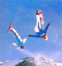 | Saltos. El saltador realiza una serie de acrobacias iniciando el ejercicio lanzándose por la pista hacia una rampa especial desde la que sale proyectado hacia el aire. La puntuación juzga el despegue, la forma y ejecución de la maniobra en el aire y el aterrizaje. Las puntuaciones de los jueces se multiplican por el grado de dificultad y se descartan las puntuaciones mayor y menor. | ![]() |