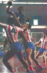 | Pasó a ser juego de pista cubierta en los años 1940 y se juega con 7 por bando con 5 sustituciones permitidas. los jugadores pueden correr tres pasos con la pelota antes de pasarla o botarla. Los hombres juegan dos periodos de 30 minutos cada uno y las mujeres dos de 25. El jugador puede tocar la pelota con cualquier parte de su cuerpo, excepto con los pies. | ![]() |