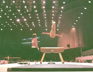 En el potro, la dama salta a través del aparato, que no es tan alto como el de los hombres. Tanto en ejercicios obligatorios como en los opcionales, se permite la utilización de dos potros y el que obtiene la marca más alta es el que cuenta para la puntuación. La salida debe regresarse cayendo sobre los pies, en buena postura y sin vacilaciones o desequilibrios.